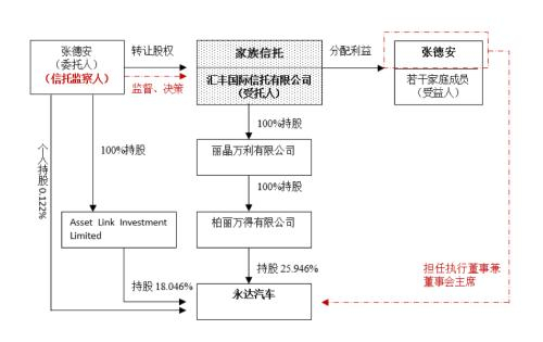 操作模式:2012年4月,Asset LinkInvestment Limited(张德安全资控制的公司)将其持有永达汽车的部分股份(约30%),无偿赠与给柏丽万得有限公司——该公司由丽晶万利有限公司全资拥有。2012年4月5日,张德安成立家族信托,将其全资持有的丽晶万利有限公司的股份,全部转让给受托人汇丰国际信托有限公司,张德安及其家庭成员作为受益人。为了确保受托人遵照信托条款并为受益人的利益服务,张德安担任该家族信托的监察人,实时监督受托人的信托管理行为。