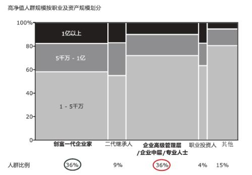 根据《2019财富报告》,在高净值人群中,企业主占非常高的比例,且其身价上亿的比例最高。其中,创富一代企业家与企业中高层(包括高级管理层、企业中层及专业人士)分别占比36%。