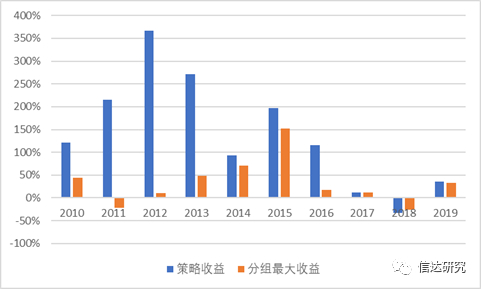 图5:2010-2019年最小市值策略投资收益和3种不同市值组最大值对比