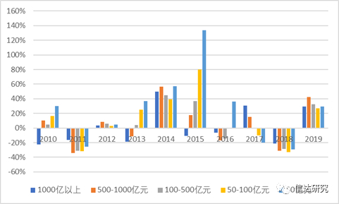 图1:2010-2019年5种不同市值组年度涨跌幅情况对比