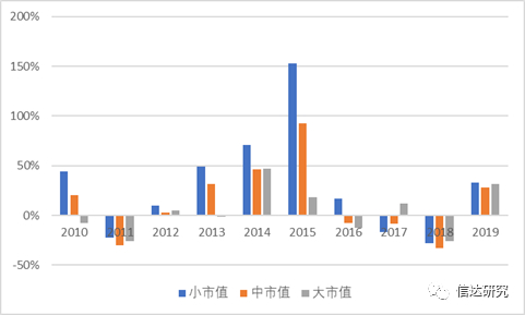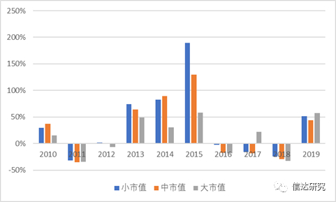 图2:2010-2019年3种不同市值组年度涨跌幅情况对比