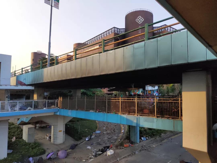 2019年11月20日下午,新京报记者实地探访发现,连接学校和港铁红磡站的南北桥均有纵火痕迹。