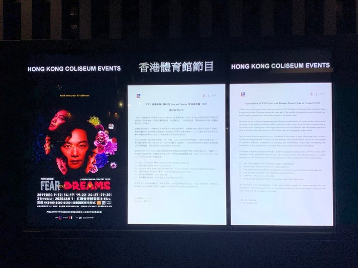 按照原本的计划,这天应是陈奕迅举办“Fearand Dreams”首场演唱会的日子,从2019年12月9日持续到2020年1月7日,总共25场。但这天,演唱会取消的公告贴满了宣传栏、售票口和红馆的各个入口。