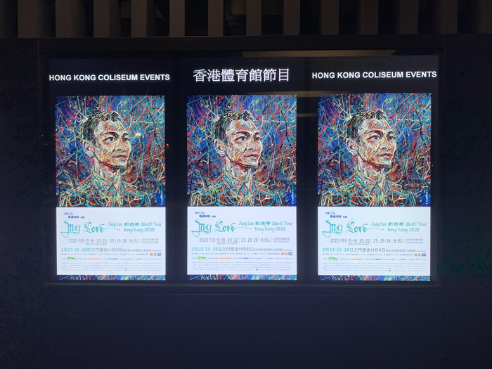 现在,在红馆门口的告示栏里,三张刘德华的演唱会大幅海报格外显眼。那是一幅五彩的刘德华抽象画,画上的他穿西装、打领带,望向前方,脸上带着笑。去年11月8日,演唱会开票后几小时内,门票全部售罄。
