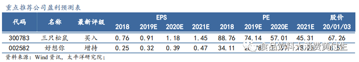 1)三只松鼠:线上渗透仍有空间,线下齐步推进直营和加盟,未来3年公司以市占率为首要目标,我们预计收入端仍能保持30%+的增速,预期未来毛利率稳定,净利率、周转率提升带动ROE缓慢提升。2)好想你:2019年百草味无业绩对赌,线上以市占率为主要目标,未来线上有望实现稳定增长,线下加强开拓,本部冻干产品有望放量,好百融合加速推进,我们预计2019年公司整体收入可期。