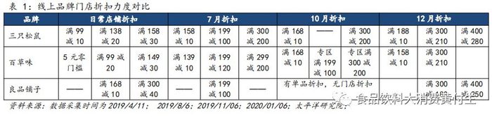 三只松鼠12月大额满减活动力度加大,从满300减200提升至减210,新增满400减280的活动,小额满减门槛提高,从满168减10变为满188减10。百草味采取跟随战略,小额满减保持不变。良品铺子12月折扣力度增强,推出满300减180(维持)、满400减250(新增)活动。