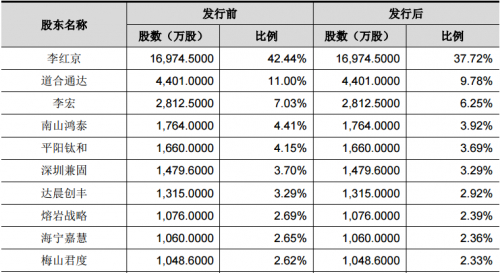 截至招股书签署日,李红京通过直接和间接的方式合计持有公司43.96%的股权,其中可支配表决权的股权比例为42.44%,为公司控股股东、实控人;员工持股平台道合通达持股比例11%,为公司第二大股东;李宏持股7.03%,为公司第三大股东。