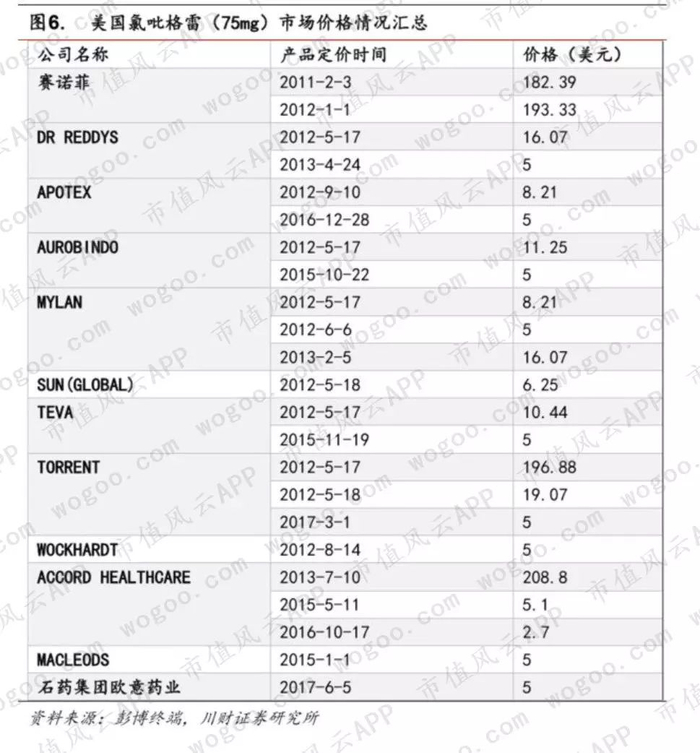本来由于原研药专利过期后会涌现很多仿制药竞争,药品价格会在短期内悬崖式地下跌。根据川财证券的研报数据,美国氯吡格雷的市场价格就在2012年5月专利过期后一个月内从将近200美元/75mg下降到5美元/75mg,前后出现20多家仿制药企业来竞争。