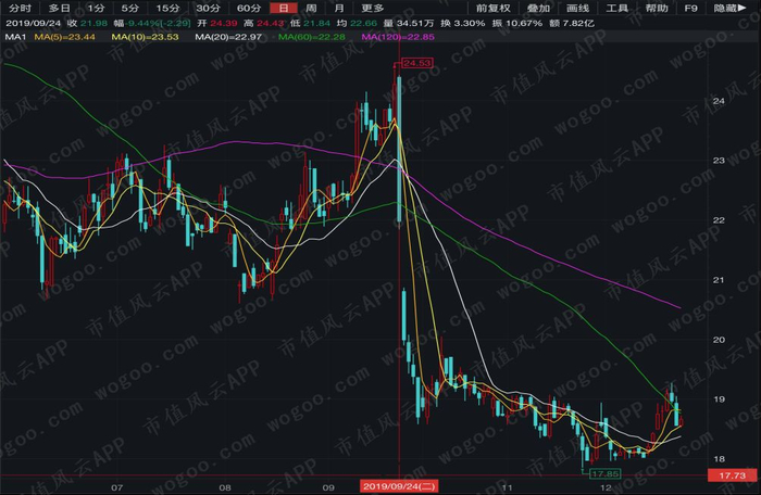 以致于公司不得不在国庆后开市的第一天(10月8日)抛出回购计划,企图维持股价稳定:1年内拟使用自有资金以集中竞价交易方式进行回购,价格不超过22元/股,回购金额不低于2.5亿,不超过5亿(约占股本2.17%)。