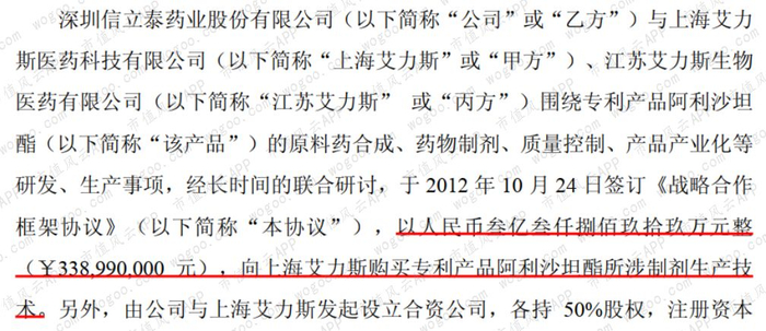2014年底又花了4.715亿收购了与上海艾力斯的合资公司,相当于花了累计8个亿收购了阿利沙坦酯(还有或有事项)。
