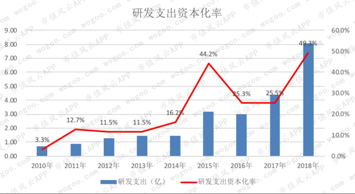 信立泰研发支出虽然2015年后增加了,但资本化率随之增加,2018年资本化率也飙升到49.3%。