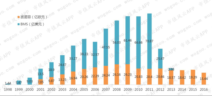 自1997年获FDA批准上市后,迅速成长为重磅炸弹级药物,上市第3年销售额便超过10亿美元,且在接下来的数年中一路飙升,2011年更是达到99.3亿美元的巅峰,即使在2012年核心专利过期后,原研药波立维每年仍有近20亿美元的销售额。