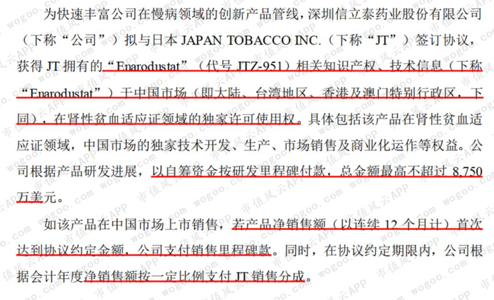 2019年12月26日,信立泰又公告与日本公司 JAPAN TOBACCO INC.签订协议,不超过8750万美元获得肾性贫血药物“Enarodustat”在中国的独家许可使用权。