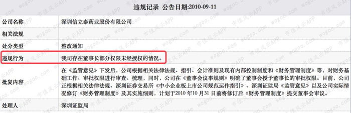 违规行为风云君只查到2010年9月有证监会的整改通知,存在董事长部分权限未经授权的情况。