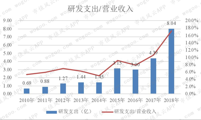 2015年之前信立泰的研发支出占营业收入的比例大约在6%左右的水平,或许没有业绩下滑的压力,2015年之后有所提高,特别是2018年飙升到17.3%。