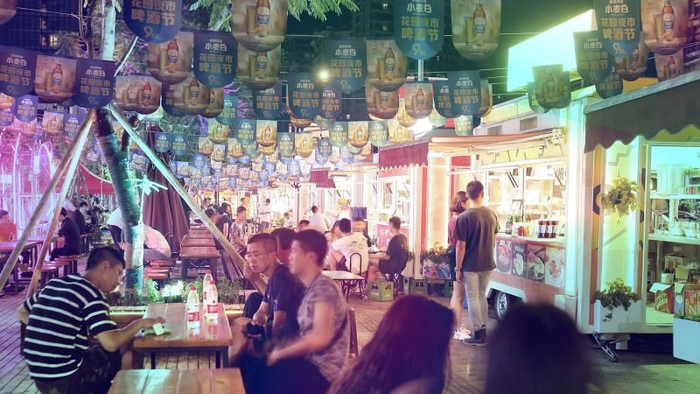比如当地著名的夜生活圣地“九街”,整条街聚集了各种酒吧、娱乐、美食,还在街边开辟了一座移动夜市花园。