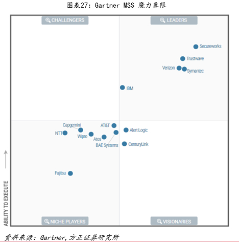 中期:全球安全服务市场包含了众多参与者。全球安全服务市场参与者众多,其中咨询公司、电信运营商、大型IT公司、系统集成商扮演重要角色。从全球安全服务市场的主要参与方包含:咨询公司、独立安全咨询公司、独立MSSP、电信运营商、安全厂商、系统集成商,大型IT公司下安全部门等。其中:1)安全咨询行业:头部厂商主要为德勤、普华永道、安永、毕马威、埃森哲、IBM、博思艾伦等咨询公司或IT咨询服务提供商:2)安全运营(MSS,托管安全服务):包括symantec、IBM等专业安全厂商、ATT、NTT、CenturyLink等电信运营商及Secureworks等独立MSSP;3)安全集成:格局较分散,包含系统集成商以及政府外包服务提供商等。