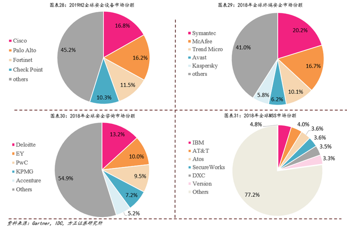 竞争格局:1)与全球市场不同,安全厂商未来将国内安全服务市场将扮演更加重要的角色;2)行业发展初期,龙头厂商具备品牌及整体解决方案的优势,竞争力要明显强于中小型安全厂商。