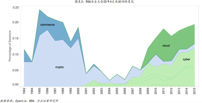 产业演进路径:从加密与商业化,到云与网络空间安全。RSA大会作为全球网络安全技术的风向标,每年对安全议题的讨论其对于安全行业有非常强的前瞻价值,RSA会议4个关键“commerce(商业)”、“crypto(加密)”、“cloud(云)”和“cyber(网络空间)”的频率在上世纪90年代以及2010年代这两个时期发生了显著变化:其中“commerce(商业)”和“crypto(加密)代表着上世纪90年代开始网络安全正在从一种技术工具逐渐走向商业化,而最早的安全技术就是通信加密技术。从 2010年之后,“cloud(云)”和“cyber(网络空间)“在RSA的关注度快速提升,代表云以及网络空间安全成为了网络安全行业的重要趋势。