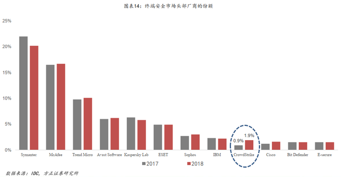 终端安全:新兴安全厂商包括Crowdstrike、Cylance、CB等凭借基于云端的轻量化的终端安全解决方案及EDR、威胁情报等技术,实现在终端安全市场的持续替代。随着基于签名和文件的传统终端安全解决方案在应对新兴安全威胁时逐渐失效,终端安全技术的重心正从过去的预防与阻止逐渐转向检测与响应,同时伴随着越来越多的企业转向云基础设施,以及云在业务流程中的重要性逐渐提升,终端安全的重心也从过去的端点向云端逐渐迁移。