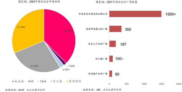 1)第一个10年:行业最早可追溯80年代密码技术的应用,1995-2000年,天融信、启明、绿盟等第一批安全厂商成立、市场在1999年前后开始启动,到2000年初国内从事网络安全行业的公司数量剧增,行业格局分散,根据IDC的统计,和信息安全相关的注册公司数量达1500家以上,厂商数量达到300家以上。厂商基本集中在反病毒、防火墙、商密、IDS等几大细分市场。