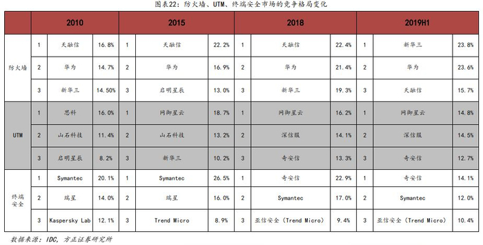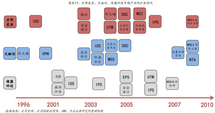 2)早期安全行业的“战国七雄”:启明星辰、绿盟、天融信、安氏、亿阳、联想网御、华为。