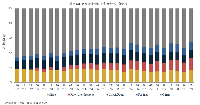 网络层安全:Palo Alto Networks及Fortinet等下一代防火墙厂商份额持续提升。根据IDC的数据,全球网络安全设备市场(以防火墙为主,包含IDPS、VPN等)最近10年的竞争格局发生了显著变化,随着下一代防火墙在全球范围内渗透率的持续提升,以 Palo Alto Networks及Fortinet为代表的等新兴防火墙厂商的市场份额持续提升,而Cisco、Check point、Juniper等老牌防火墙厂商的份额基本处于稳定或下滑趋势。