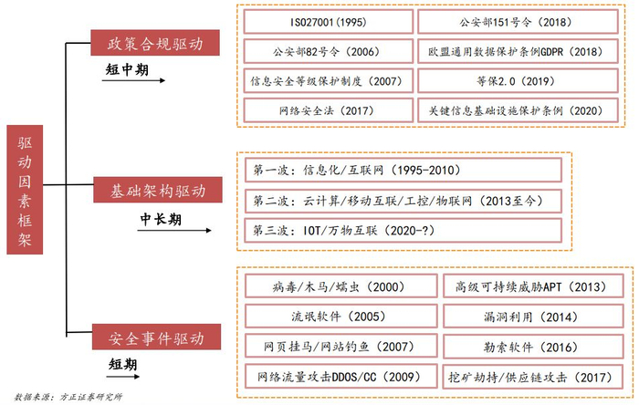 1、驱动因素框架:包括安全政策驱动、基础设施驱动以及安全事件驱动。三大驱动因素分别在短、中、长期,总量与结构上对行业产生不同程度的影响。