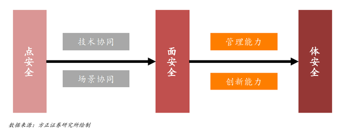 长期来看,由多个单“面”安全厂商引领各个网络安全细分子行业的发展将成为产业竞争格局的最终形态。1)从“点”安全向“面”安全的延伸,实现底层技术及应用领域上的深度协同,是安全厂商持续发展,做大做强的必然趋势,是经济学层面的必然;2)从“面”安全向“体”安全的延伸,安全厂商需要面临企业管理及创新能力的双重挑战,是管理学层面的偶然。