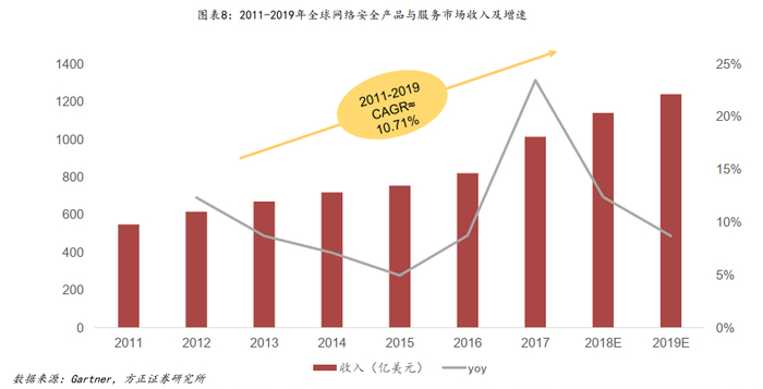 全球:行业整体仍保持高景气度。近10年全球网络安全行业保持在较高的景气度,2010-2019全球网络安全行业复合增速保持在10%左右,主要受全球安全威胁及事件的导致的安全风险增加,面向云等新的IT架构转型带来的新的安全业务需求的驱动。同时从2017年开始,全球安全支出增速呈现提升的趋势,主要受欧盟通用数据保护规则(GDPR)等法规对安全服务市场的带动,GDPR涉及欧盟地区企业或在欧盟开展业务的的企业,根据gartner的估算,到2019年,全球至少有30%的企业机构将产生GDPR相关服务的支出,包括实施、评估并审核与GDPR相关的业务程序所涉及的安全咨询等服务。
