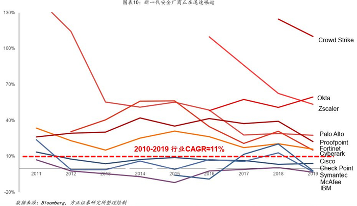 全球安全市场大变革:新一代安全厂商迅速崛起。以Palo Alto、Okta、Zscaler、Crowdstrike为代表的新兴安全厂商正持续替代老牌安全厂商的市场份额产业竞争格局变化背后的底层驱动因素:技术迭代、模式变革。
