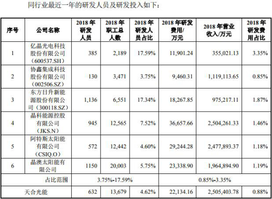在与同行业公司进行对比时,天合光能选择了上市公司亿晶光电、协鑫集成、东方日升等6家公司。其中,亿晶光电2018年研发费用占比最高,达3.35%;协鑫集成研发费用占比最低,为0.85%;其余4家公司研发费用占比均超1%。