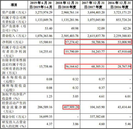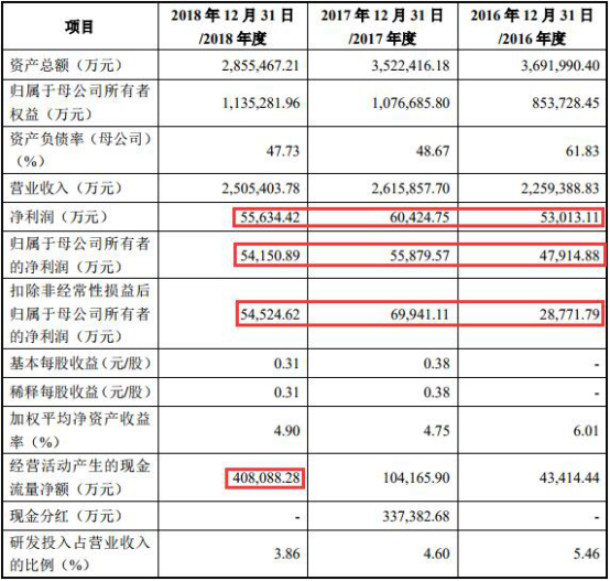 申报版招股书显示,2016年至2018年,天合光能实现净利润分别为5.30亿元、6.04亿元、5.56亿元;实现归属于母公司所有者的净利润分别为4.79亿元、5.59亿元、5.42亿元;实现扣除非经常性损益后归属于母公司所有者的净利润分别为2.88亿元、6.99亿元、5.45亿元。