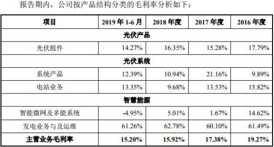 报告期各期,天合光能主营业务毛利率分别为19.27%、17.38%、15.92%和15.20%。