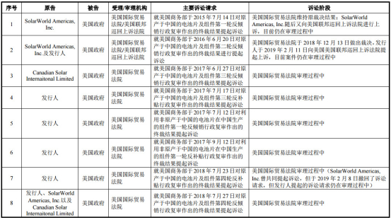 此外,截至2019年6月30日,因美国商务部对原产于中国等地区的光伏产品展开“双反”调查并征收相应的保证金,且美国商务部已就历年“双反”复审调查结果对相关案件作出了终审裁决,天合光能作为原告或第三方正在参与8起针对美国政府的双反诉讼。