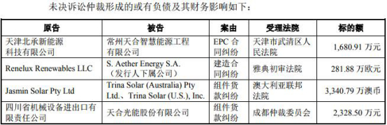 天合光能表示,上述诉讼均系由公司的正常经营活动所引起,且涉案金额占公司最近一年经审计的净资产的比例较小,但不排除未来出现新的诉讼纠纷,从而对公司经营造成不利影响的风险。