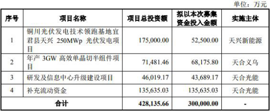 招股书显示,天合光能预计融资金额为30亿元,募集资金将用于铜川光伏发电技术领跑基地宜君县天兴250MWp光伏发电项目,晶硅、太阳能电池和光伏组件技改及扩建项目,研发及信息中心升级建设项目以及补充流动资金。