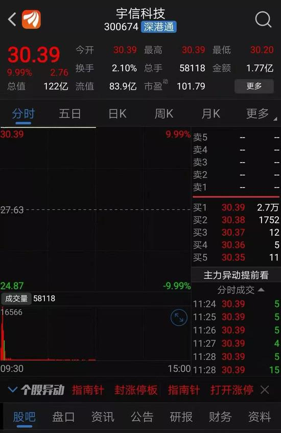 宇信科技股价应声涨停。截至午间收盘时,报30.39元。