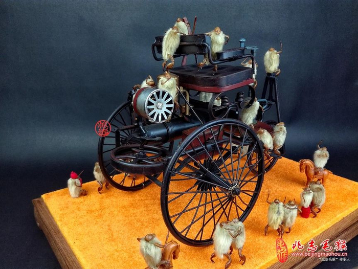 后来,他一口气做了30多个,不同姿态的毛猴,把它们固定在奔驰车的座椅上、轮胎上,奔驰车四周,还围着20多个毛猴。它们都饶有兴致地打量着奔驰车,仿佛看到了什么新奇玩意。“当年,第一辆奔驰车开进北京城时,市民的反应,大抵也是这样了。”