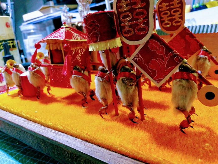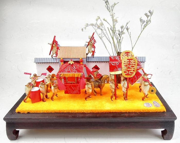 于是,母亲开始赋予毛猴角色,她把毛猴想象成轿夫,做了一个迷你轿子,将毛猴的手粘在轿子把手上。旁边,还有毛猴拿着唢呐、锣鼓奏乐,一个送嫁的场景就出来了。