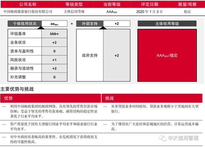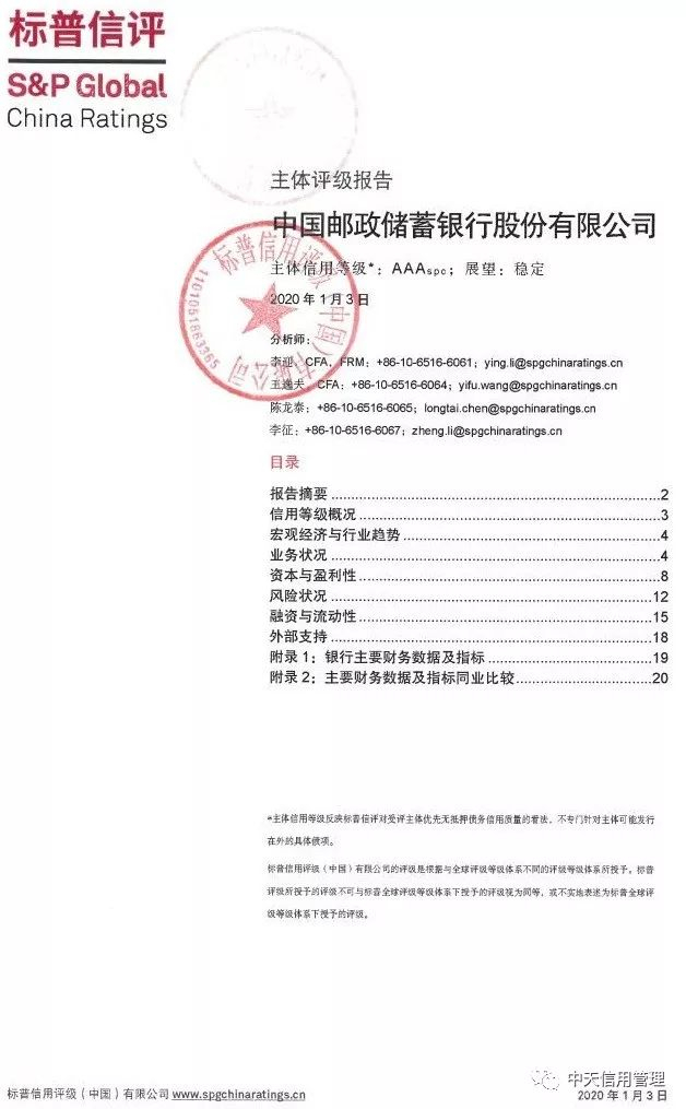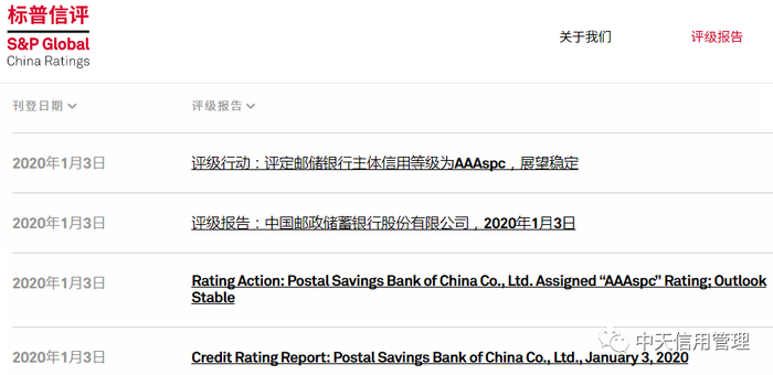 原标题:"标普中国"发布2020年首份国内发债主体信用评级报告 邮储银行获评最高"AAAspc"等级,展望稳定 来源:中天信用管理