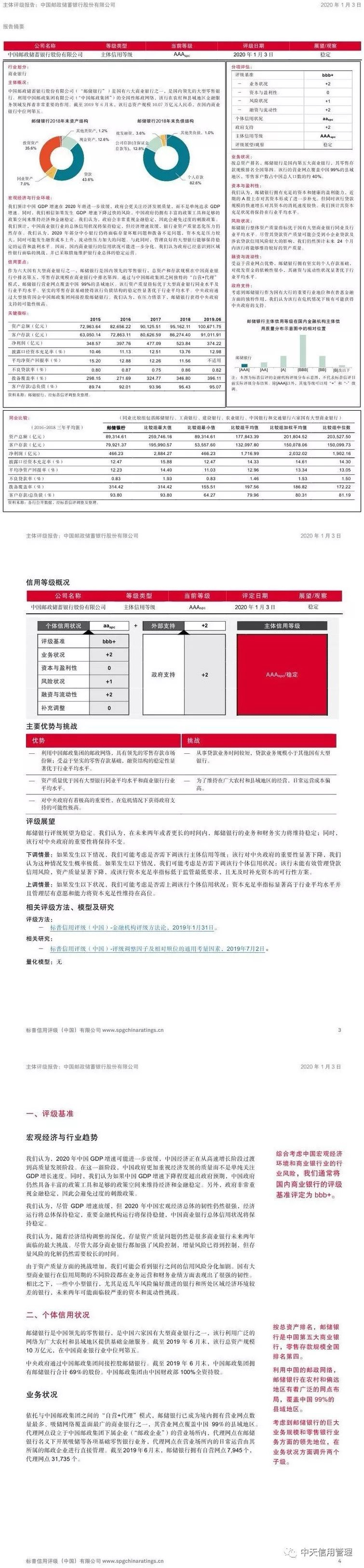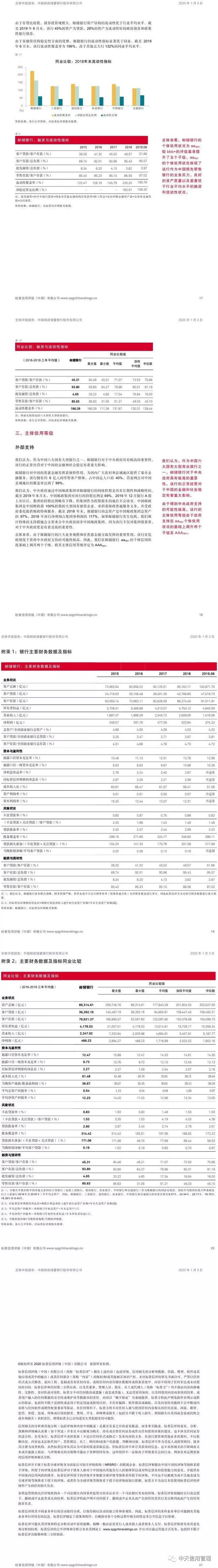 "标普中国"发布2020年首份国内发债主体信用评级报告 邮储银行获评最高"AAAspc"等级,展望稳定