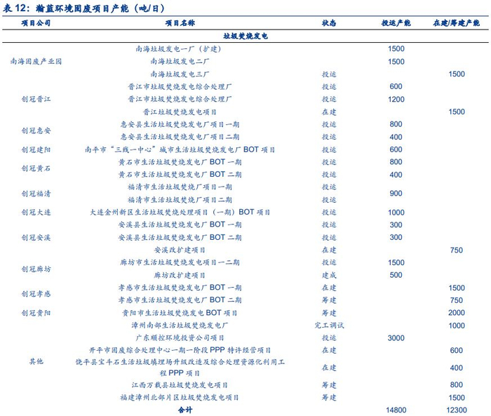 公司在手固废项目充足,增长确定性高。目前,公司拥有4个固废处理环保产业园、22个生活垃圾焚烧发电项目、3个垃圾填埋场项目、2个垃圾压缩转运项目、7个餐厨处理项目、4个污泥处理项目、3个危废处理项目、4个农业垃圾处理项目等,生活垃圾焚烧发电处理总规模31,500t/d,生活垃圾卫生填埋总库容量1,105万立方米,垃圾压缩转运6,650t/d、餐厨垃圾处理1,450t/d、污泥处理1,550t/d、危废处理19.6万吨/年、农业垃圾处理125t/d。