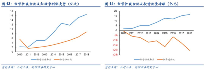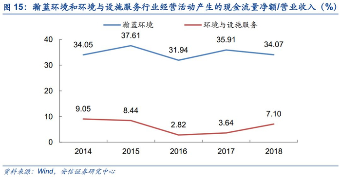 公司2014-2018年经营活动产生的现金流量净额占营业收入的比例显著高于环境与设施服务行业整体水平,收入质量较高。2018年公司经营活动产生的现金流量净额为16.52亿元,同比增长9.48%。公司现金流充裕,为进一步扩张提供了保障。