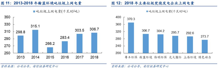 上网电量稳定提高,展现强运营能力。垃圾发电收入是垃圾焚烧企业的重要收入来源,发电收入等于上网电量乘以电价,上网电量为垃圾焚烧发电扣除公司自用电量后剩余的部分,公司效率越高,自用电量消耗就越少。吨垃圾上网电量除了与垃圾热值有关以外还与公司的技术和管理效率有关,是衡量公司运营效率的有效指标。2016-2018年公司吨垃圾上网电量稳步提高,2015年公司收购创冠中国后吨垃圾上网电量有所下降,但此后吨垃圾上网电量稳定提高,至2018年为306.7千瓦时。2018年,公司吨垃圾上网电量位于同类企业前列。