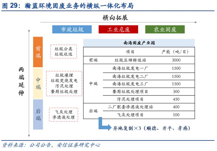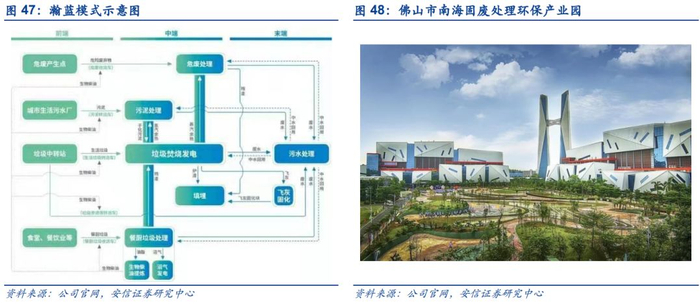 “瀚蓝模式”实现固废处理从源头到终端的无缝链接和管控。公司在南海区的固废产业园实现从生活垃圾收运、垃圾处理、污泥处理、渗滤液及灰渣处理的完整产业链,开创了从源头到终端治理的城市固体废弃物系统化处理模式,实现区内生活垃圾 100%无害化处理,打造了固废处理行业标杆,被业内称为“瀚蓝模式”。环保产业园设计充分考虑各处理环节的资源共享、资源互用,建设固体废弃物全产业链处理系统的能力,包括前端的垃圾集中压缩转运;中端的生活垃圾焚烧、餐厨垃圾处理、污泥干化处理以及正在规划建设的危废处理;末端的渗滤液处理、飞灰处理,形成了由源头到终端完整的固体废物处理产业链。