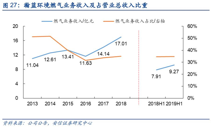收购布局燃气业务,稳步拓展,实现区域外突破。公司燃气业务主要由燃气发展开展,公司在2011年收购燃气发展25%股权,并于2012、2014、2017年先后增资15%、30%和30%其成为公司的全资子公司。燃气发展业务覆盖整个南海区域,业务涉及管道液化石油气、管道天然气及液化石油气的供应及相关配套业务、燃气工程的技术咨询和信息服务。2016年公司收购瀚蓝能源70%股权,燃气业务首次实现异地突破——公司获得江西省樟树市CNG加气母站1座以及樟树市11个镇街的燃气特许经营权。2019上半年燃气发展实现营收9.46亿元,同比增长16.9%,净利润0.89亿元,同比下滑11%,贡献公司合并净利润的近20%。