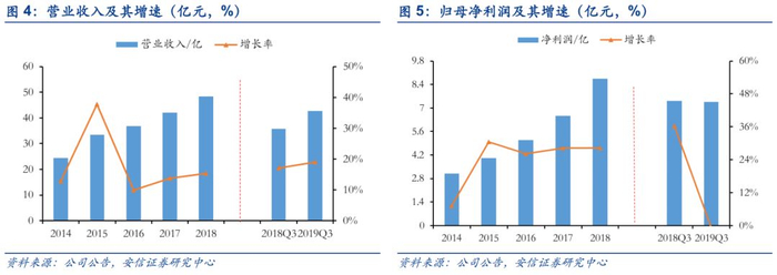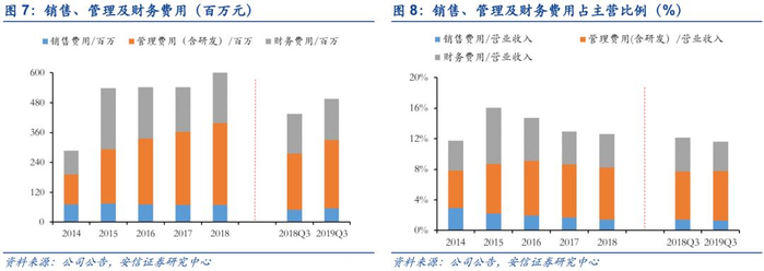 公司费用管控良好,低于行业水平。2016-2018年公司期间费用率持续下滑,2018年公司管理费用(含研发)因薪酬上升而上升至3.29亿元,但管理费用率仍下降0.2pct。2019Q3公司期间费用率继续下降0.54pct,主要系财务费用率下降0.54pct所致。公司期间费用率始终低于行业平均水平,2018年公司期间费用率为12.6%,行业均值为19.3%。