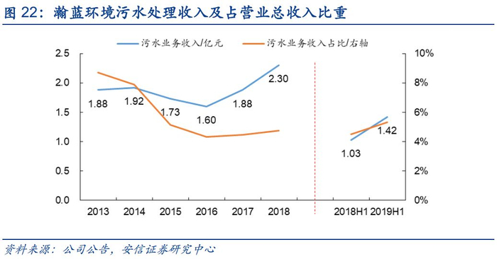 2013-2018年公司污水处理收入基本保持稳定,年化增长率4.12%。公司2019年上半年污水处理收入为1.42亿元,同比增长37.9%,占营业总收入的5.32%,公司污水业务收入占比较小,但2019年有上升迹象。