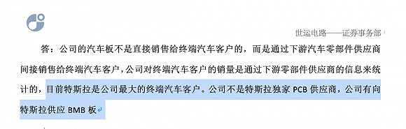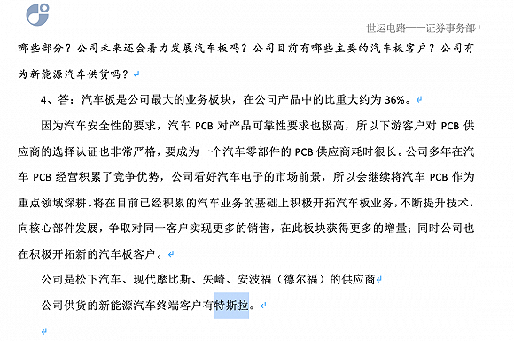 更早一些的调研纪要显示,在2019年12月接受方正证券调研时,世运电路表示,“公司供货的新能源汽车终端客户有特斯拉。”